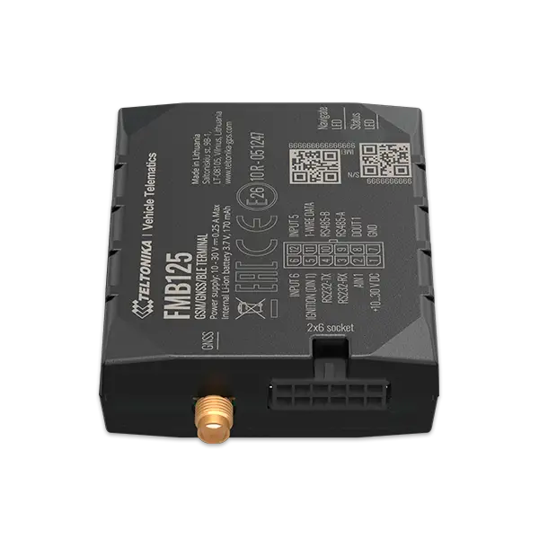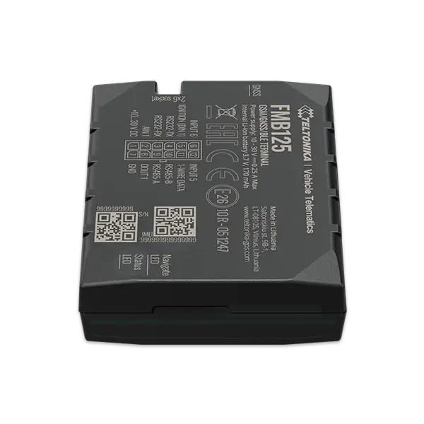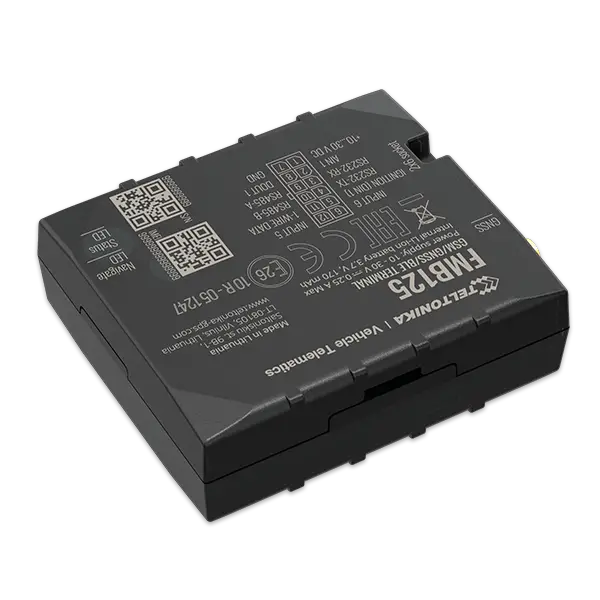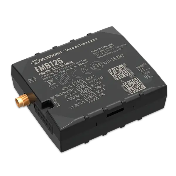 FMB125 small and professional tracker with internal high gain GSM and external GNSS antennas, which is able to collect device coordinates and other useful data and transfer them via GSM network to server. This device is perfectly suitable for applications where location acquirement of remote objects is needed: fleet management, car rental companies, taxi companies, public transport, logistics companies, personal cars and so on. FMB125 can perform tasks on remote objects, such as monitoring engine status, controlling truck’s door etc.