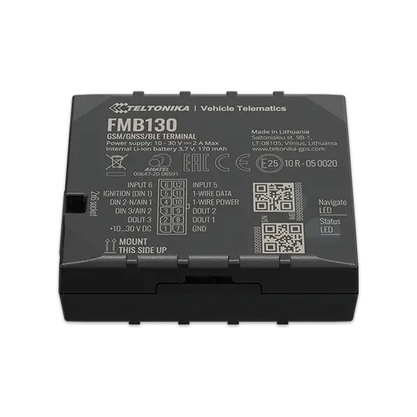 FMB130 is ADVANCED tracker with internal GNSS, GSM antennas, configurable digital/analogue inputs/negative input/impulse inputs, three DOUT outputs, Bluetooth connectivity and backup battery.