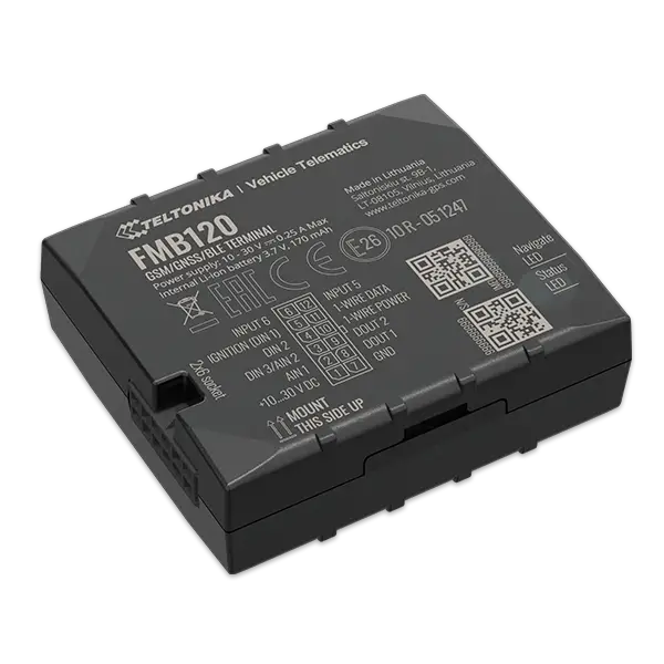FMB120 small and professional tracker with internal high gain GSM and GNSS antennas, which is able to collect device coordinates and other useful data and transfer them via GSM network to server. This device is perfectly suitable for applications where location acquirement of remote objects is needed: fleet management, car rental companies, taxi companies, public transport, logistics companies, personal cars and so on. FMB120 can perform tasks on remote objects, such as monitoring engine status, controlling truck’s door etc.