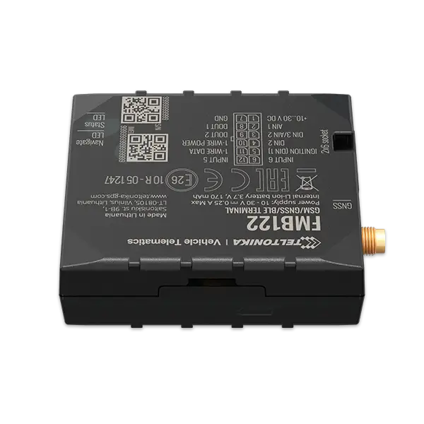 FMB122 small and professional tracker with internal high gain GSM and external GNSS antennas, which is able to collect device coordinates and other useful data and transfer them via GSM network to server. This device is perfectly suitable for applications where location acquirement of remote objects is needed: fleet management, car rental companies, taxi companies, public transport, logistics companies, personal cars and so on. FMB122 can perform tasks on remote objects, such as monitoring engine status, controlling truck’s door etc.