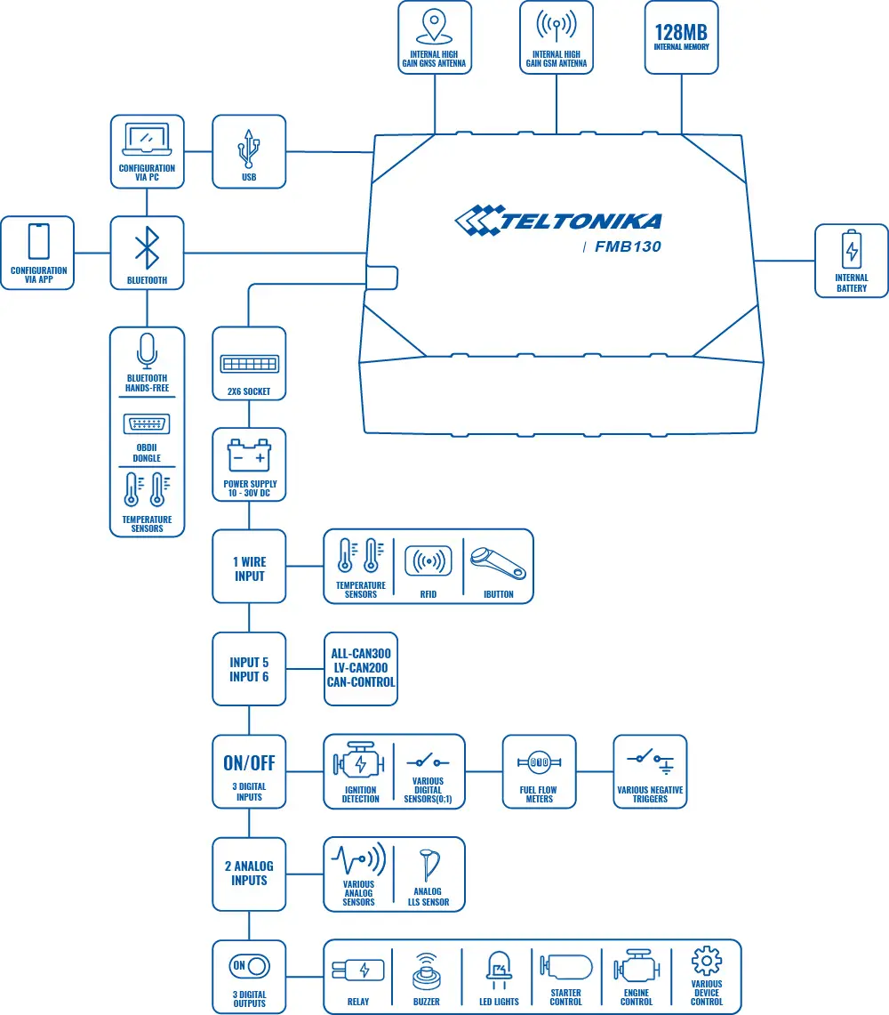 Teltonika keeps its promise to make IoT Easy. FMB130 device is the first device with negative input possibility. It allows you to save your precious integration time while connecting accessories like vehicle door sensor, alarm button, seatbelt detection and similar sensors or accessories.
