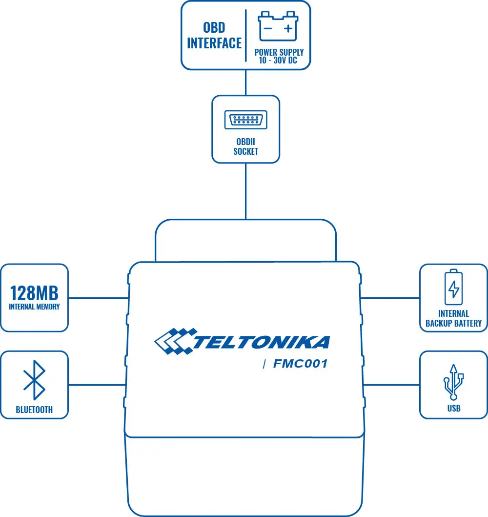 Teltonika FMC001 represents next step in communication technology – this is the first Plug and Track LTE OBD device with GNSS and Bluetooth connectivity. Possibility to read OBD II parameters, effortless installation and detailed accelerometer data provides a compelling solution. This is perfect tracker for a wide range of applications – fleet management of light commercial vehicles, car rental & leasing, driver log-book, insurance telematics (UBI) and so on. Device supports various Bluetooth Low Energy sensors, beacons, firmware and configuration update via Bluetooth.