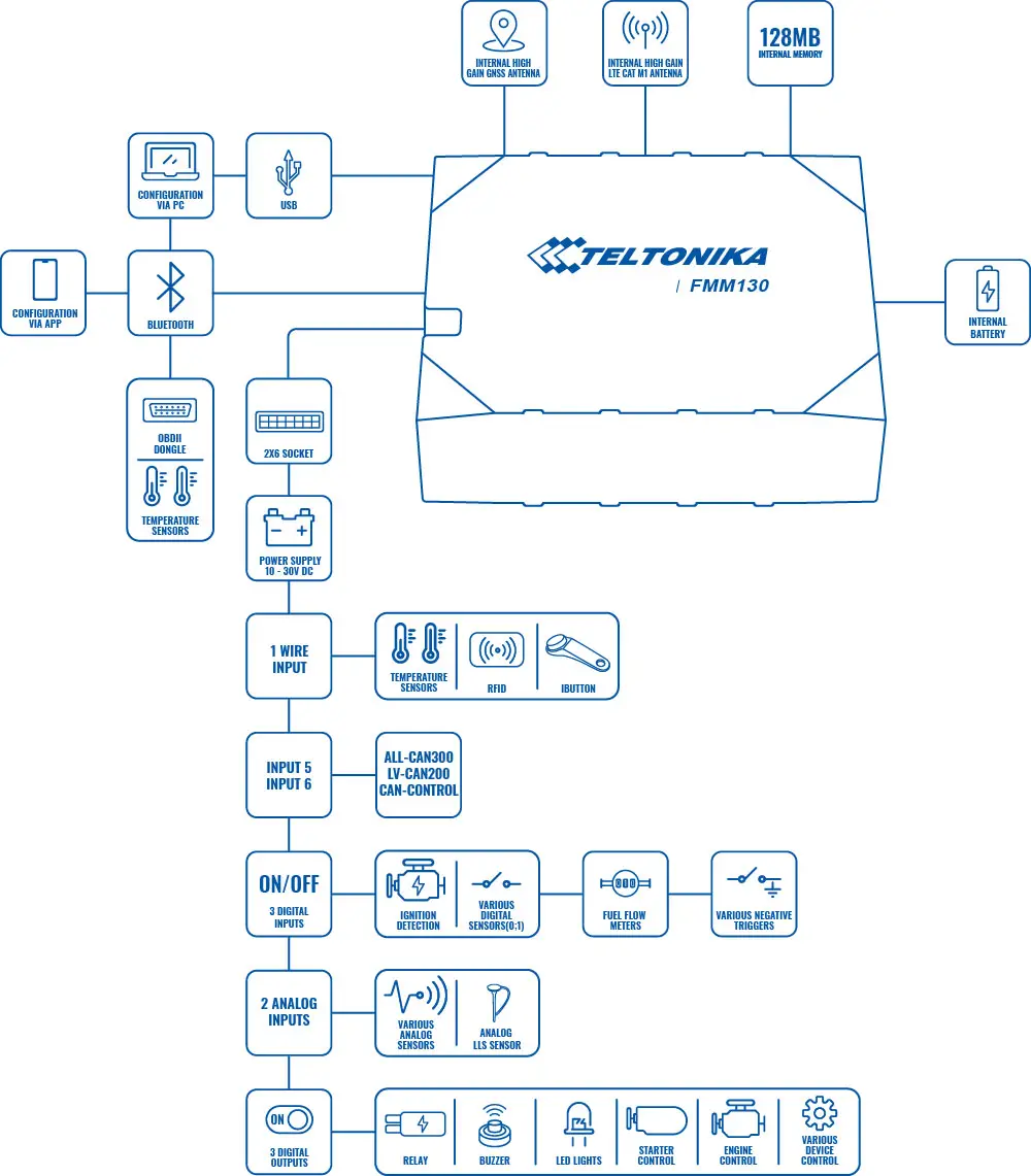 | Configuration and firmware update | FOTA Web, FOTA, Teltonika Configurator (USB, Bluetooth), FMBT mobile application (Configuration) |