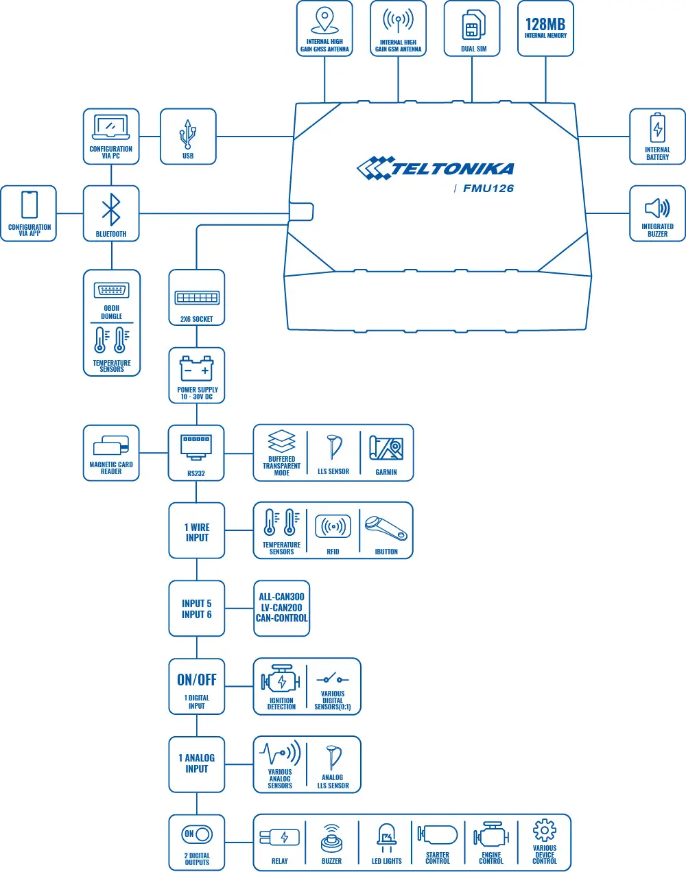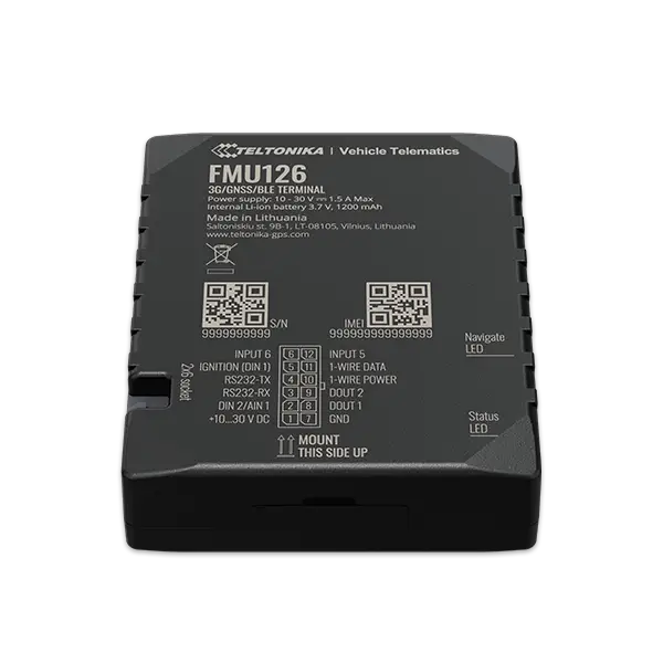 Newly introduced FMU126 is an advanced real-time tracking terminal with 3G network coverage and fallback to 2G. Device equipped with GNSS/Bluetooth and 3G modules, internal GNSS and internal 3G antennas. Teltonika designed a tracker to fulfil the requirements of Department of Land Transport (DLT) and deliver additional value for GPS telematics solution providers by high-end features: